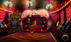 - Dans Ocarina of Time 3D, on peut apercevoir sur les étagères qui sont en premier-plan à droite et à gauche les masques qui se tiendront sur le sac à dos du vendeur dans Majora's Mask.