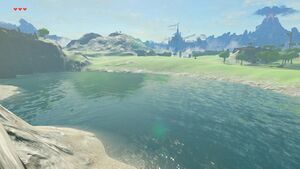 La plaine d'Hyrule nord entre la rivière Divinéa et la tour des collines, par-delà la rivière Divinéa. Des Bokoblins à cheval rôdent sur cette prairie verdoyante.