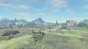 La vieille place des commerces est un ensemble de ruines désertes se trouvant au sud de la tour de la plaine. Un camp de Bokoblins est implanté au sud de ces ruines.