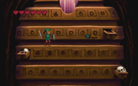 Le début du niveauLe niveau débute en extérieur, dans une zone infestée de Sancromy invisibles. Pour les voir, Link doit avoir obtenu la lanterne de vision de la part de Gwonam, au terrain de l'ermite. Au bout du chemin se trouve une caverne avec des fourmis rouges et autres chimères, puis une salle avec beaucoup de sable où Militron est réaffronté. Celle salle contient aussi des vers qui peuvent se révéler gênant en raison de leur petite taille, qui empêche Link de les toucher même en s'accroupissant.